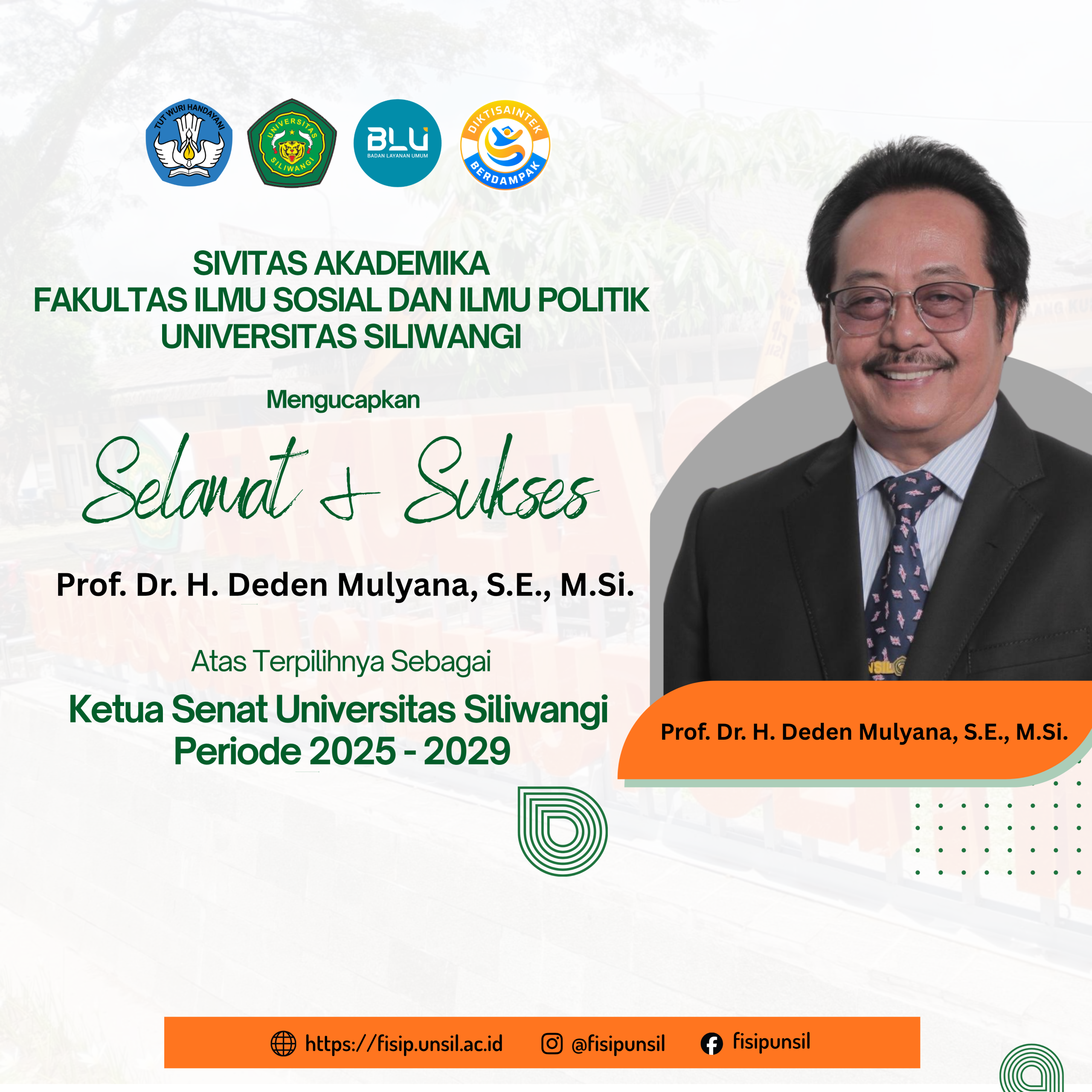 Segenap Sivitas akademika Fakultas Ilmu Sosial dan Ilmu Politik Universitas Siliwangi mengucapkan: Selamat & Sukses kepada Prof. Dr. H. Deden Mulyana, S.E., M.Si. atas terpilihnya sebagai Ketua Senat Universitas Siliwangi Periode 2025–2029. Semoga amanah baru ini dapat membawa keberkahan, memajukan Universitas Siliwangi, serta menjadi inspirasi bagi seluruh sivitas akademika.