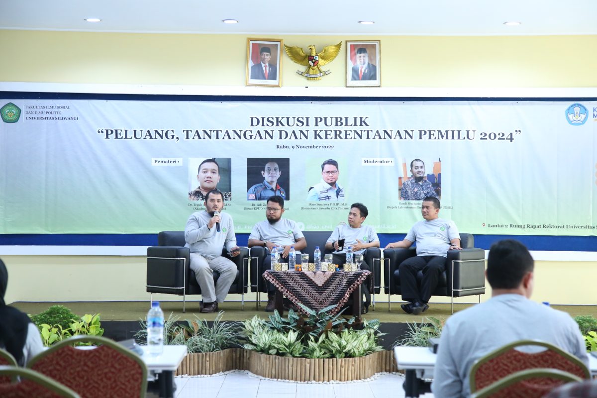 Tasikmalaya – Rabu, 9 November 2022 Fakultas Ilmu Sosial dan Ilmu Politik menyelenggarakan kegiatan Diskusi Publik dengan tema “Peluang, Tantangan dan Kerentanan Pemilu 2024”. Kegiatan ini merupakan salah satu respon dari lingkungan akademisi untuk berkontribusi dalam mewujudkan pemilu yang berintegritas. Acara ini diawali dengan kegiatan laporan ketua panitia yaitu Riska Sarofah, S.IP., M.I.P menurutnya kegiatan ini dilatarbelakangi oleh hasil evaluasi pemilu 2019 yang perlu diperhatikan oleh semua stakeholders. Menjamin pelaksanaan pemilu 2024 dari aspek siklus pemilu, kerentanan dan partisipasi publik menjadi tanggung jawab bersama. Penyelenggara pemilu harus mampu bertindak responsif pada proses persiapan hingga pelaksanaannya. Diskusi ini menghadirkan berbagai pembicara dari lingkungan akademisi, penyelenggara pemilu yaitu KPUD Kota Tasikmalaya dan Komisioner Bawaslu Kota Tasikmalaya. Peserta pada diskusi terdiri dari perwakilan Pemerintah daerah, LSM dan mahasiswa. Pada akhir pidatonya ketua Panitia menambahkan bahwa seluruh elemen masyarakat harus mampu mengambil bagian pada monitoring pelaksanaan pemilu.